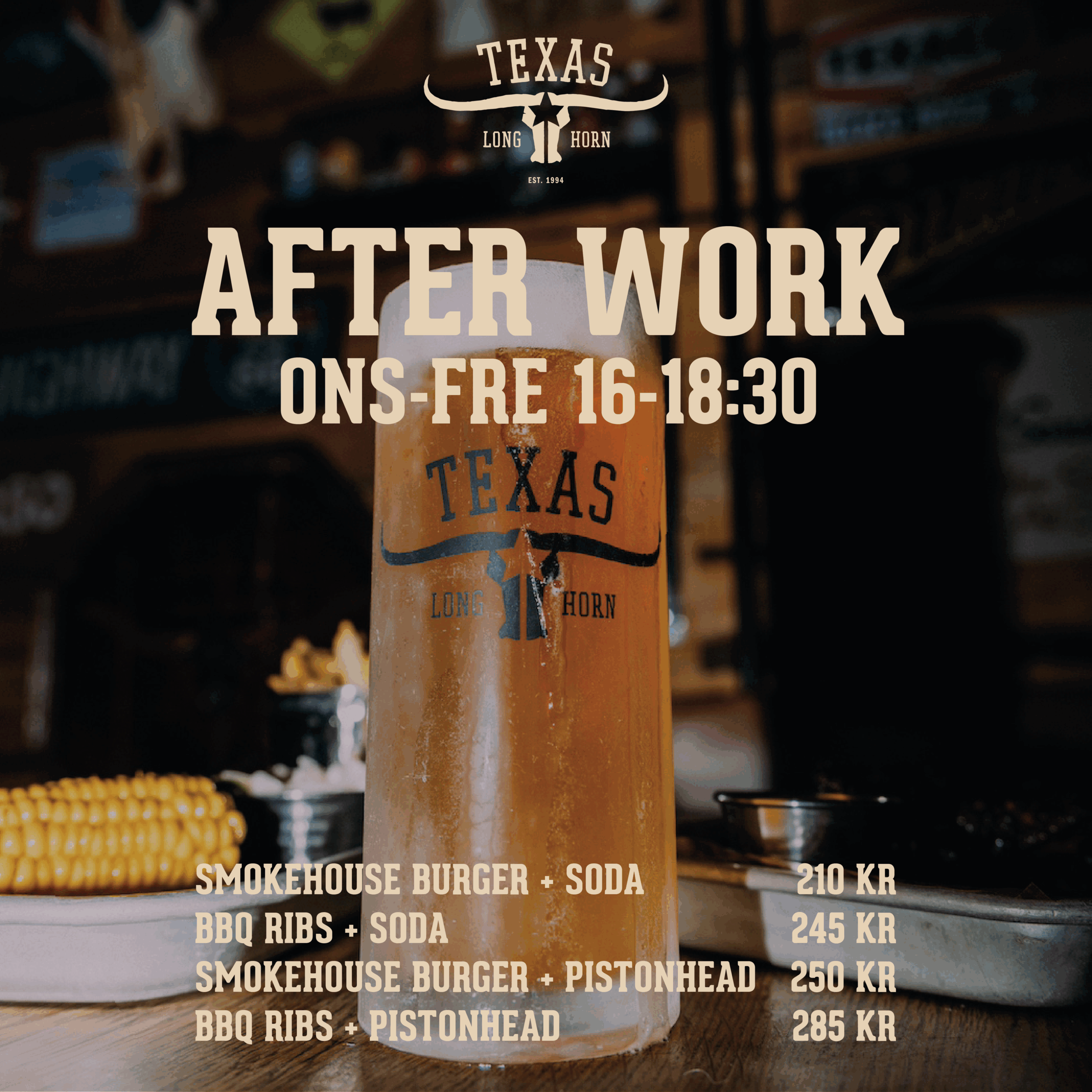 Nedan kan du hitta hela vår stora barn, middag, lunch, bar, take away och dryck-meny som vårt kök erbjuder. Har du fler frågor kring köket eller olika maträtter på vår meny, fråga gärna våra duktiga servitörer eller personal på Hornsbergs Strand som med bästa betyg finns på plats för att guida dig att välja rätt Texas barbecue och typ av kött.