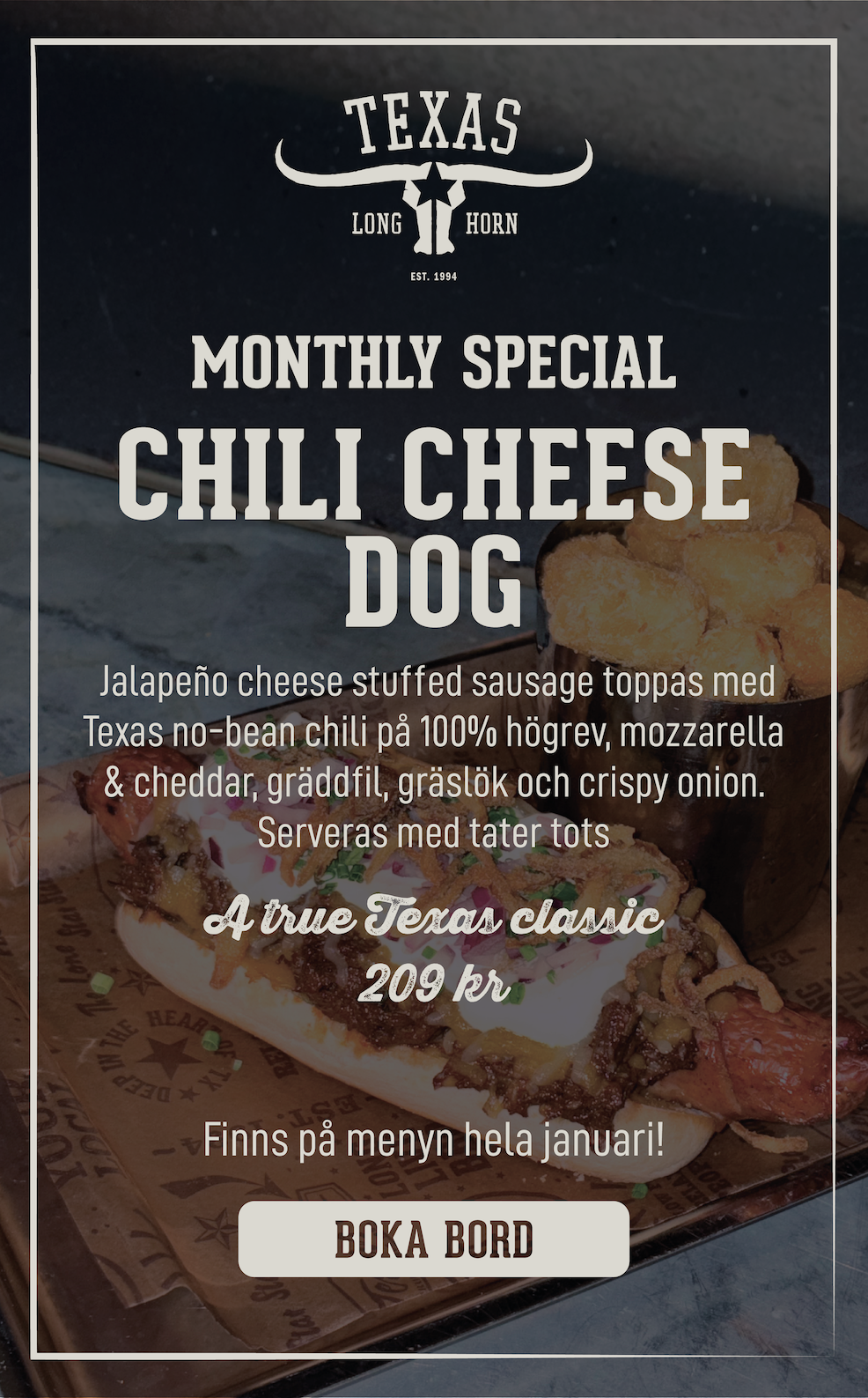Texas no-bean chili på 100% högrev, mozzarella & cheddar, gräddfil, gräslök och crispy onion.