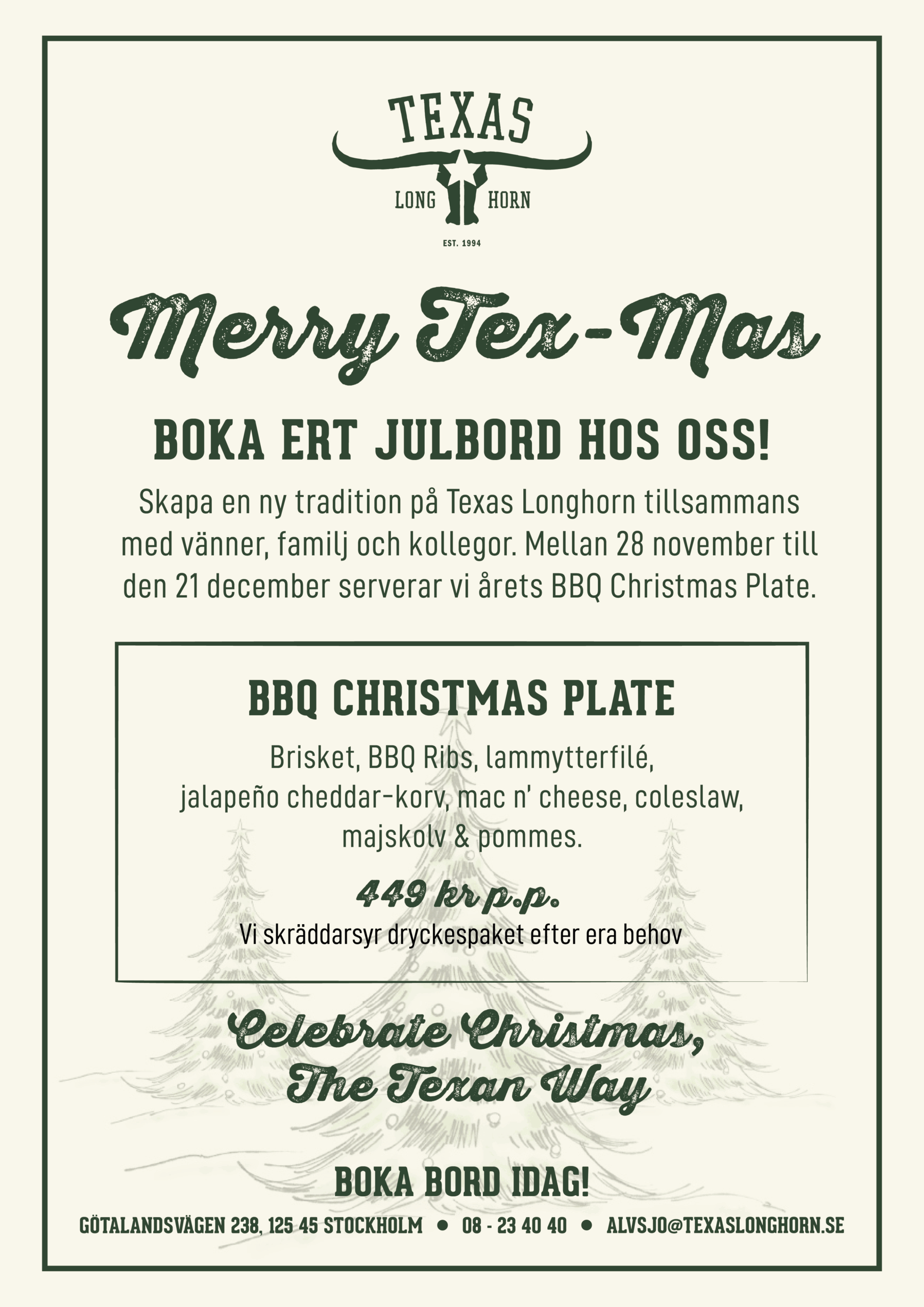 Välkommen till Texas Longhorn Telefonplan. Här njuter du av grillad steakhouse-mat, äkta Texas barbecue, sport på storbild, livemusik, quizkvällar samt lunch, middag, takeaway och catering. Perfekt för både familjemiddagar och företagsevent i en varm och avslappnad atmosfär.